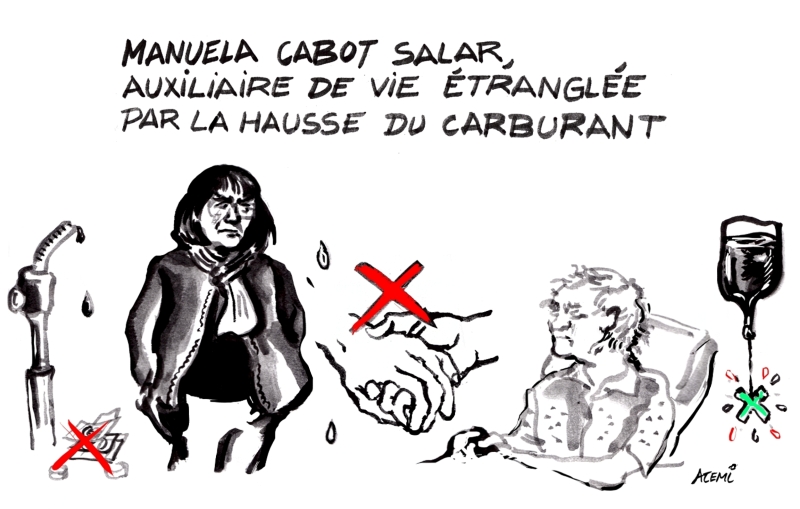 inspiré de l’article d’ Eugénie Barbezat : « Y’en a pour qui travailler coûte de l’argent » : Manuela Cabot Salar, auxiliaire de vie étranglée par la hausse du prix du carburant, 6 avril 2026, l’Humanité, Social et Économie
